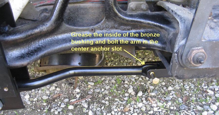 Grease the bushing that's pressed into the other end of the arm (do not remove the bushing from the arm). Push the end of the arm up into the slot in the center anchor block. Align the bushing with the hole in the anchor block, and insert the bolt through the front. Wipe the grease off the threads and put the lock nut onto the bolt in back, but do not torque yet.