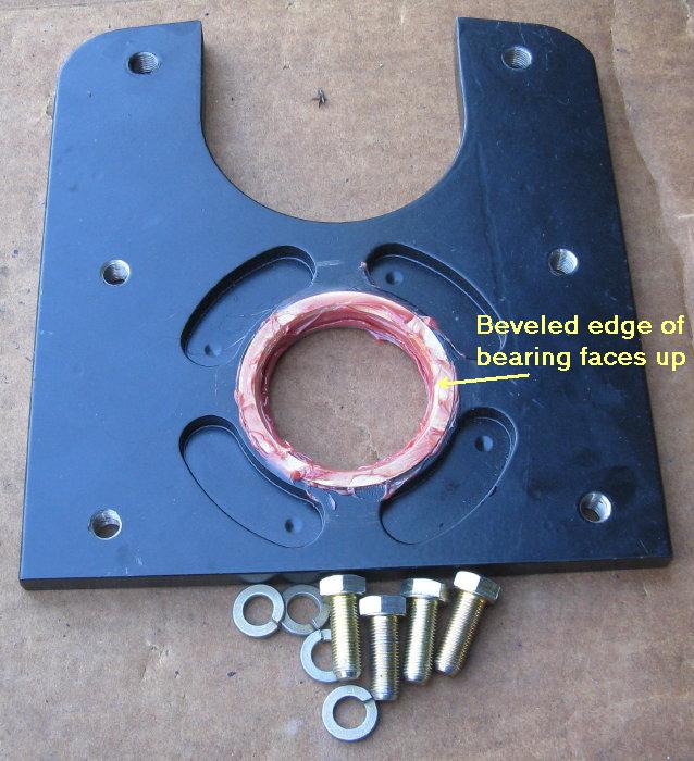 Thoroughly grease the torque box washer, stud, the hole in the block, and all sides of the bearing. Place the washer on the stud. (Early kits had small legs on the washer. These are omitted in later kits.) Place the bearing over the stud on top of the washer.