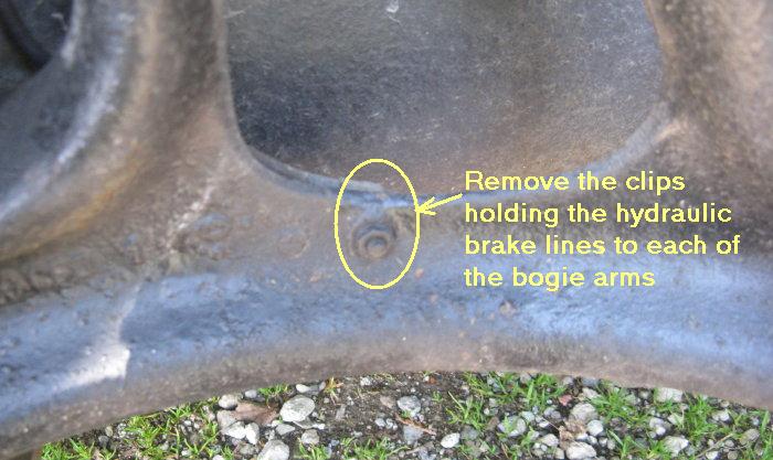 Remove the bolts that hold the small clips supporting the hydraulic brake lines at the middle of each bogie arm. If the clips are big enough, you may be able to reuse them for the new rubber brake hoses.