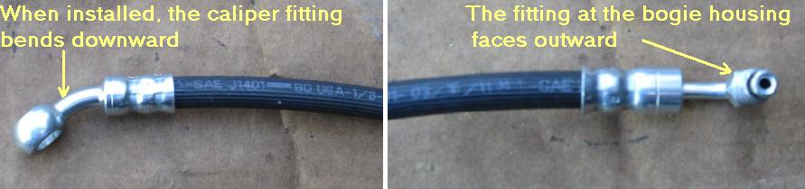 With the hose held horizontally, the loop that attaches to the caliper should angle downward. The end with 90 degree bend and threaded fitting should face outward, toward you.