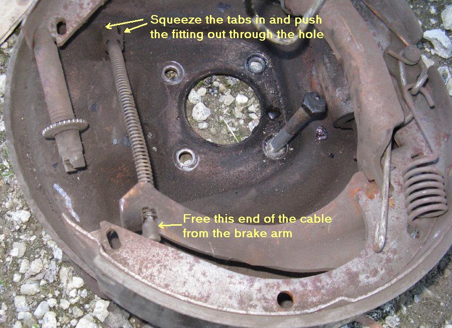 Partially disassemble the drum shoes and arms from the REAR wheel drum plate assembly enough so you can get to the end of the long brake cable. Detach the end of the cable from the drum brake arm. Remove the cable sheath from the plate by squeezing the four tabs and pushing it through the hole. Pull the whole cable and sheath assembly off of the plate.