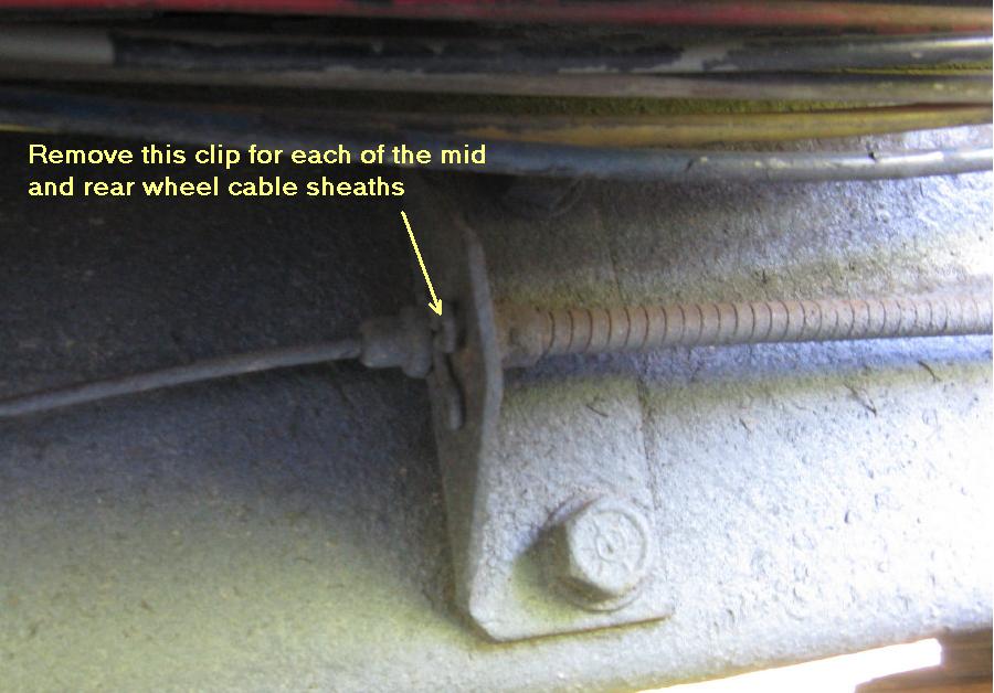 Remove the clips holding the cable sheathes to the supports on the frame rail at each rear wheel. This will allow you to pull the sheaths out of the support brackets when you remove the drum plates.