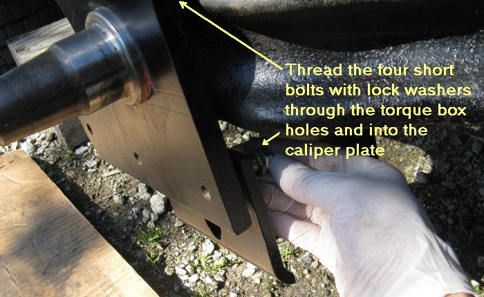Install the caliper plate on the spindle with the caliper cutout facing forward on the middle wheels, and backward on the rear wheels. The recesses on the back of the plates fit over the spindle bolt heads. Insert the four short 3/8" bolts with lock washers through the holes in the torque box and into the threaded caliper plate holes.