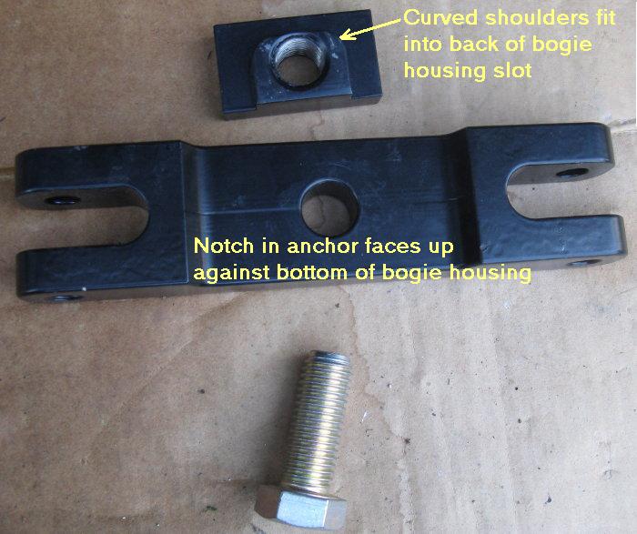 NOTE: Once the T-nut bolt is tightened, there should be a small gap between the bottom of the T-nut and the top of the anchor block. If there is no gap, remove the T-nut and grind or file a little off the bottom. There are minor variations in the thickness of the bogie castings. The T-nut needs to be firmly bolted so it can not move.