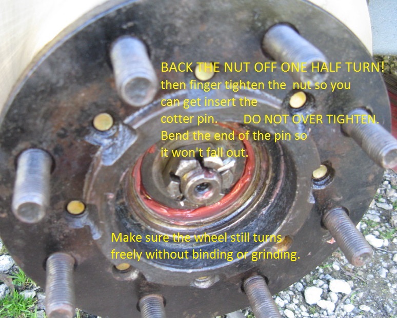 After the nut is torqued, back the nut off one-half turn and finger tighten the nut to align the hole for the cotter pin. Do not over tighten! Turn the disc/hub to check for any excess tightness, looseness, or grinding, and adjust as needed.