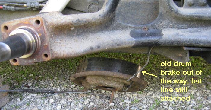 Gently pull the drum backing plate off the spindle while guiding the hydraulic lines and cables out of the way and free of their supports. Guide the attached hydraulic line around behind the bogie arm and set the whole backing plate assembly out of the way under the coach. By leaving the hydraulic lines attached, you'll avoid dripping or contaminated brake fluid. The lines can stay attached to the drums until you're ready to install the new rubber hoses in their place.
