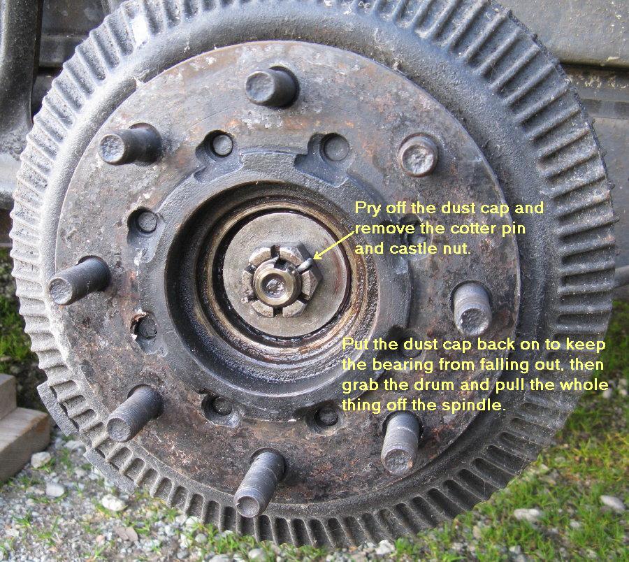 Pry off the dust cap at the center of each wheel. Remove the cotter pins and castle nuts from the spindles. Put the dust cap back on to protect the outer bearing and keep it from falling out as you remove the drum. This will also keep the correct bearing with each hub and prevent them from getting mixed up.