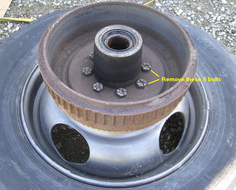 Place the drum/hub assembly upside down on one of your removed wheels with the wheel studs through the holes in the wheel. This will hold the drum still while you work. Remove the eight bolts holding the hub to the drum. If there are washers under the bolts, set them aside for reuse. The bolts will not be reused.
