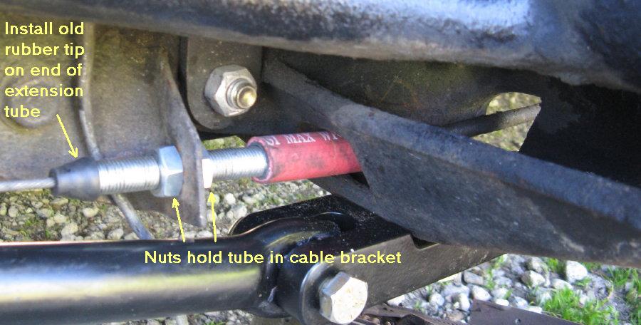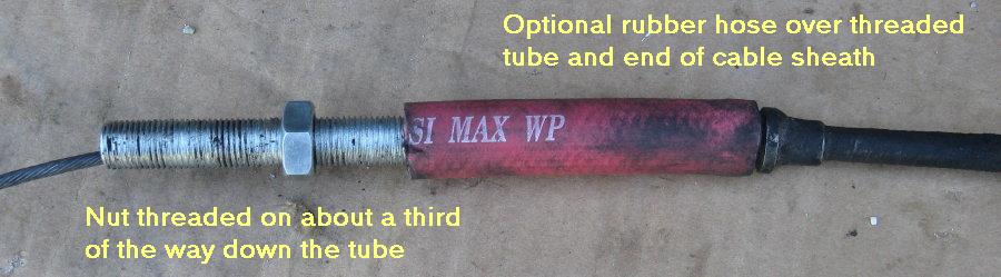 Slide the (optional) short length of rubber hose over the end of the supplied threaded tube. Thread one nut onto the rod about a third to a quarter of the way from the other end. Slide the rod and hose over the cable and butt them up against the end of the sheath. If you're using rubber hose, work it over the fitting at the end of the sheath.