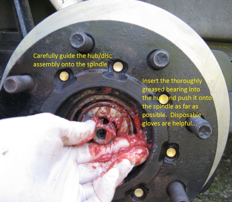 Carefully guide the hub over the spindle and push it all the way back onto the base of the spindle. Push the greased outer bearing onto the spindle, lifting up on the hub as needed.