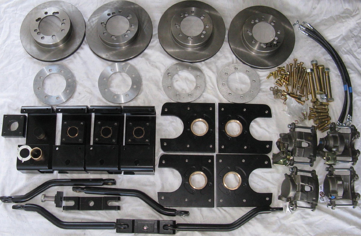 The Manny Brake Kit is also based upon Chuck Aulgur's original designs, but is Manny Trovao's own version. The kit is meant to be an effective, quality upgrade that is cheaper and easier to manufacture and install. It includes all the parts needed to add disc brakes to all four rear wheels PLUS a reaction arm system to improve brake function. The kit includes two standard GM calipers for the middle wheels, and two GM parking calipers for the rear wheels. These calipers are the same sizes used in the popular TSM kit (tsmmfg.com), which have been installed on GMCs since at least the 1990's. When combined with 80mm front calipers, these calipers provide about the same balance of front-to-rear braking as the OEM system, which should help maintain stability in wet or icy conditions. The two dual-action parking calipers provide both hydraulic and mechanical activation for use as a parking brake on the rear wheels, and are attached to the OEM brake cable system.