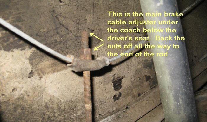 Underneath the coach, just behind the front wheel on the driver's (left) side inside the frame rail, is the main parking cable adjustment. Back the nuts off to the end of the threaded adjustment rod, but leave the cable attached. This will provide additional slack in the cables and help with adjustment later.