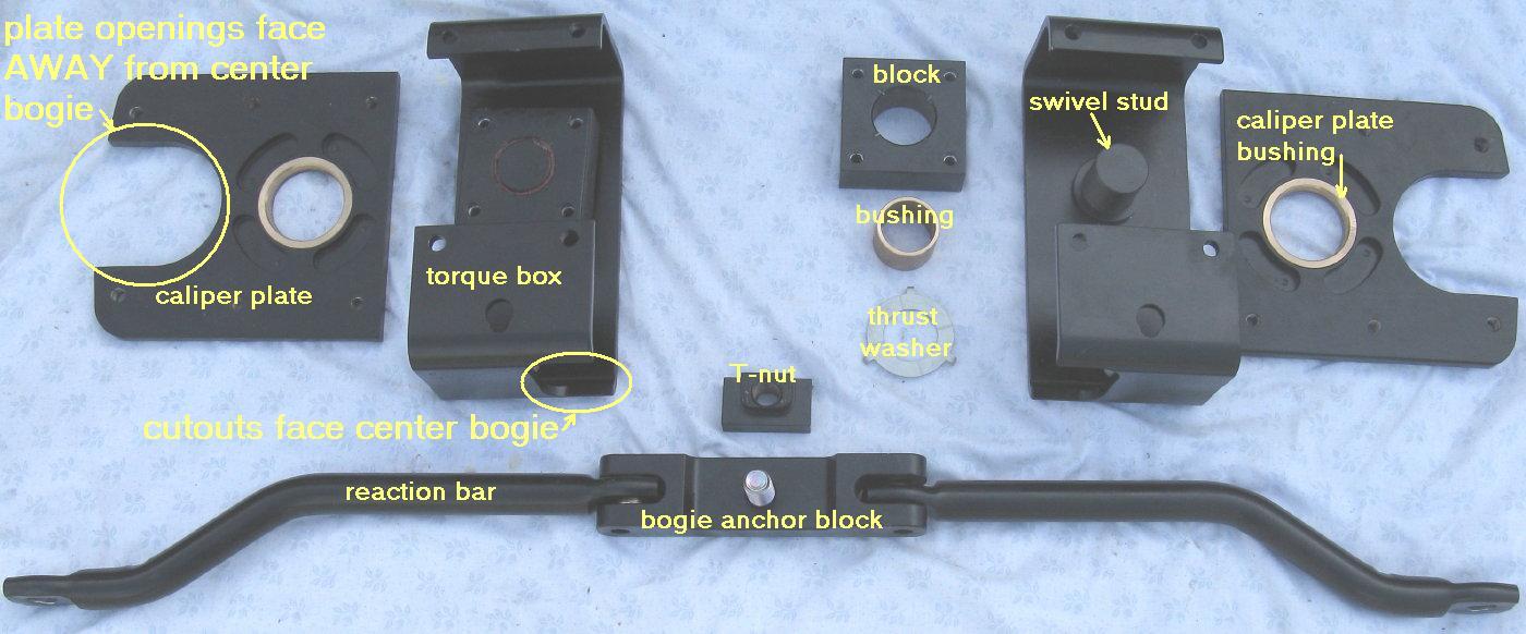 The caliper plates are all identical and mount with the cutout facing AWAY from the center bogie housing. There are two different torque boxes that are a mirror image of each other, one for the mid wheels, and one for the rear wheels. The boxes mount with the curved cutout at the bottom, facing TOWARD the center bogie housing. Select the correct box for the spindle you're working on. Powder coating has reduced the size of the un-threaded holes in the torque box and caliper plates, so assembly will be easier if you remove the coating from the interior of the holes. Do not remove metal.