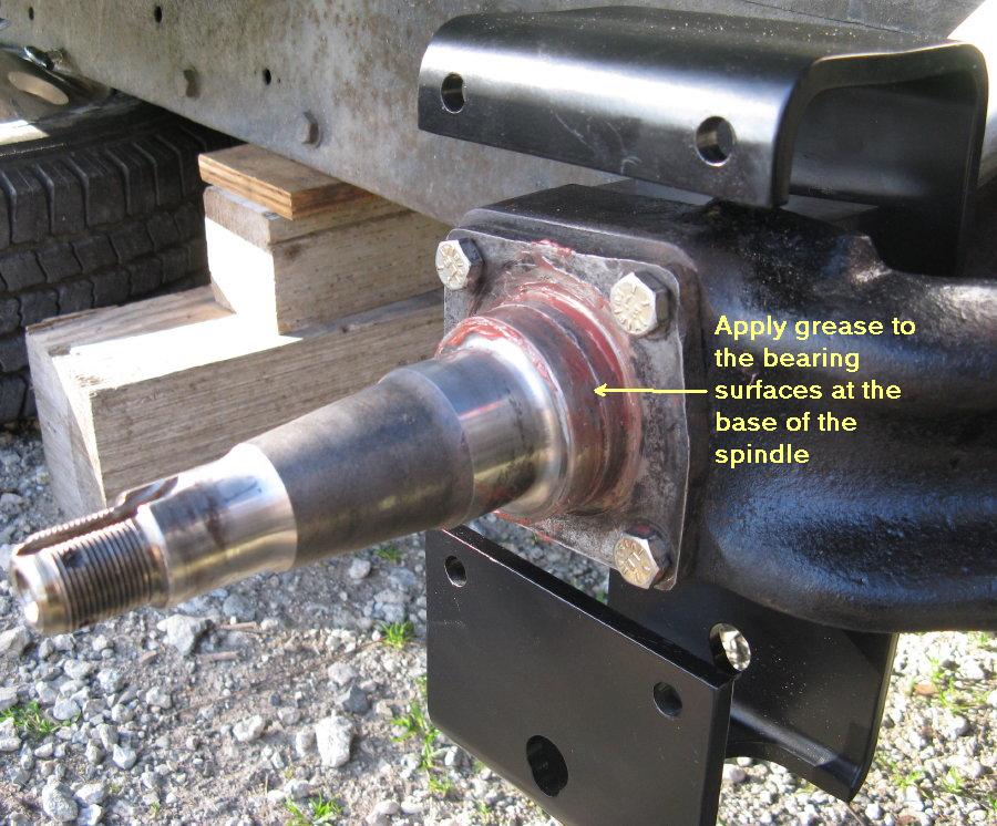 Wipe the old grease off of the spindles. Remove the 4 bolts and nuts holding the drum backing plate to the bogie arm.