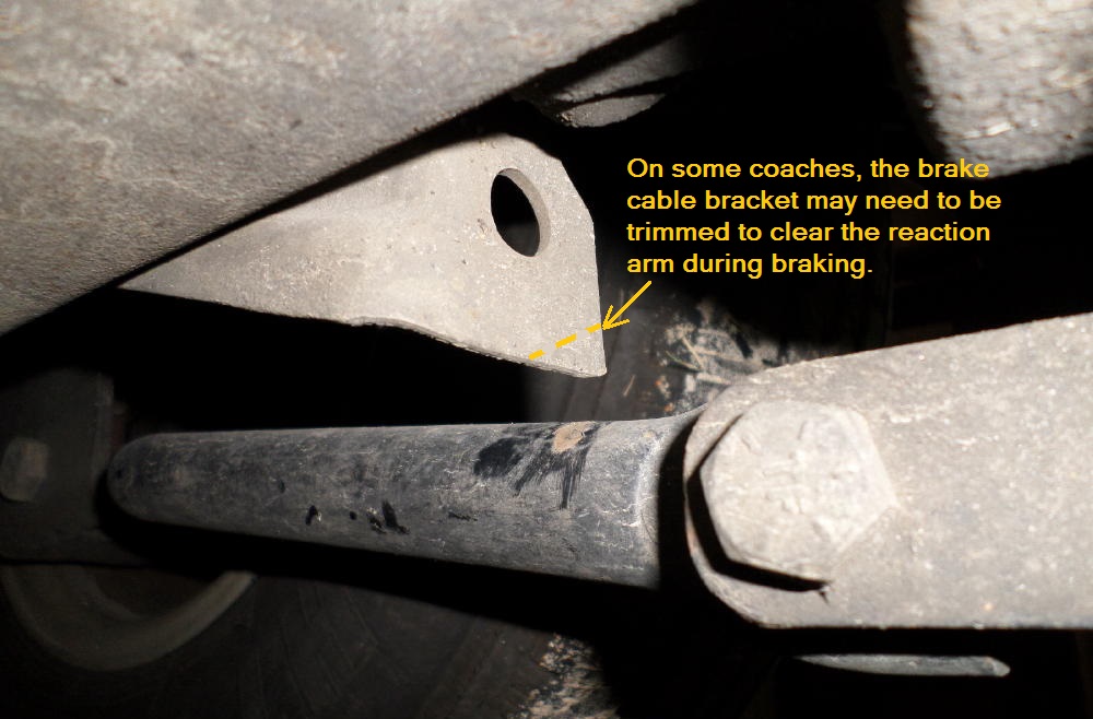 On some coaches, the bracket that supports the parking brake cable may interfere with the reaction arm when it lifts during braking. If necessary, trim the bracket back so the arm clears. As you can see in the picture above, the bracket left a scar on the reaction arm. The picture was taken from underneath the coach, looking outward.